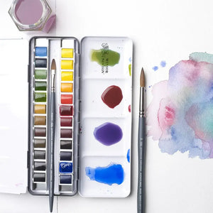 Discover 24 of our finest Professional Watercolours with unrivalled performance. They have a high concentration of fine art pigments for lightfastness and permanence. The half pans are in a travel tin that has an integral palette in the lid, a hinged flap for mixing and tinting, a thumb ring in the base, and a space for a brush. Complete Travel Tin was previously named Lightweight Sketchers Box.