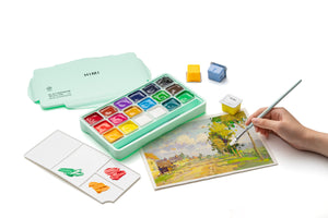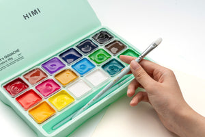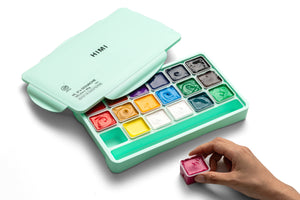The HIMI Jelly Cup Gouache Set - 18 Colours (Green Case) is a compact, resealable cup set designed for bold, opaque colour with minimal setup. Open the lid and paint - perfect for quick studies, sketchbooks and beginner-friendly gouache work.