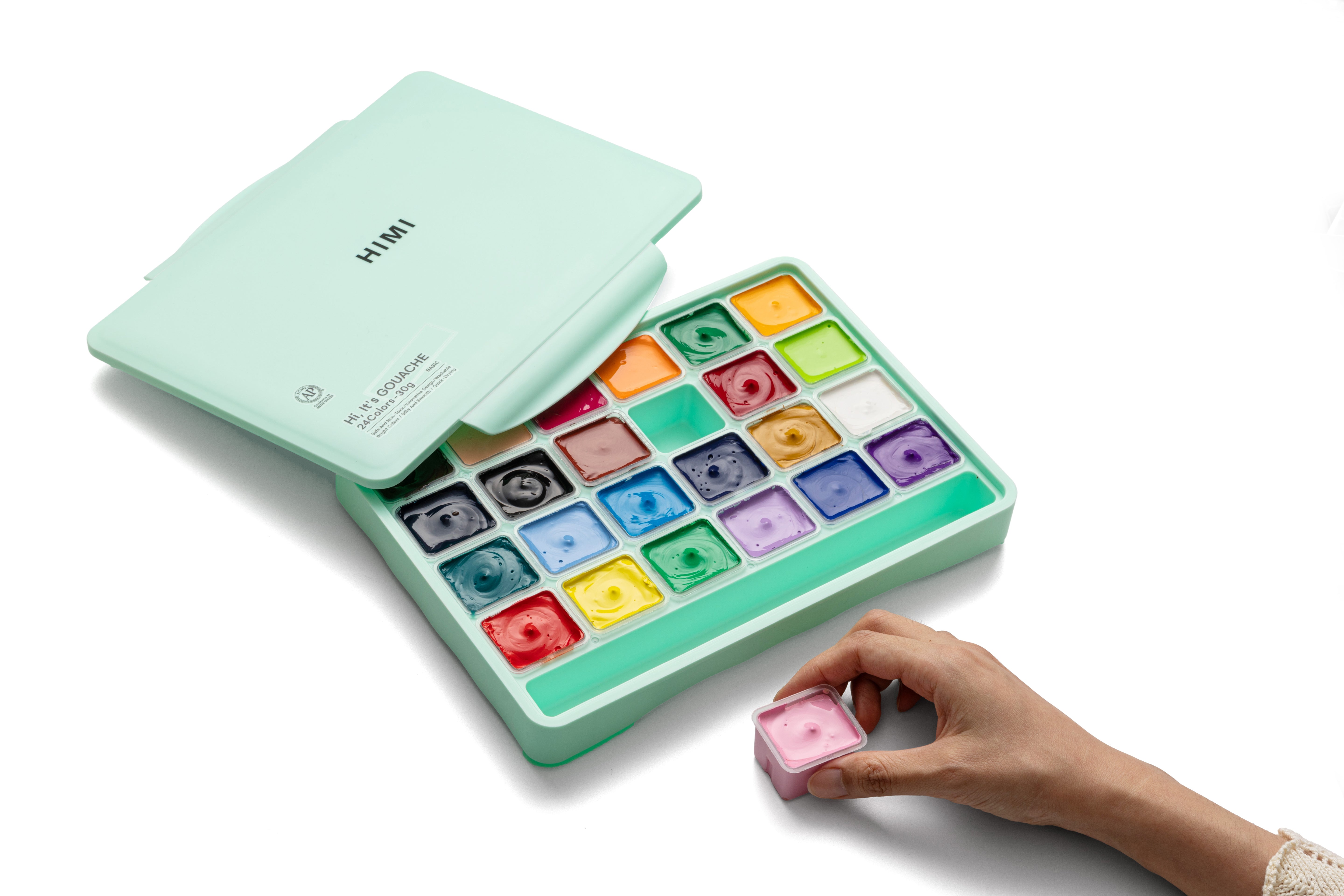 The HIMI Jelly Cup Gouache Set - 24 Colours (Green Case) is a compact, resealable cup set designed for bold, opaque colour with minimal setup. Open the lid and paint - perfect for quick studies, sketchbooks and beginner-friendly gouache work.