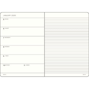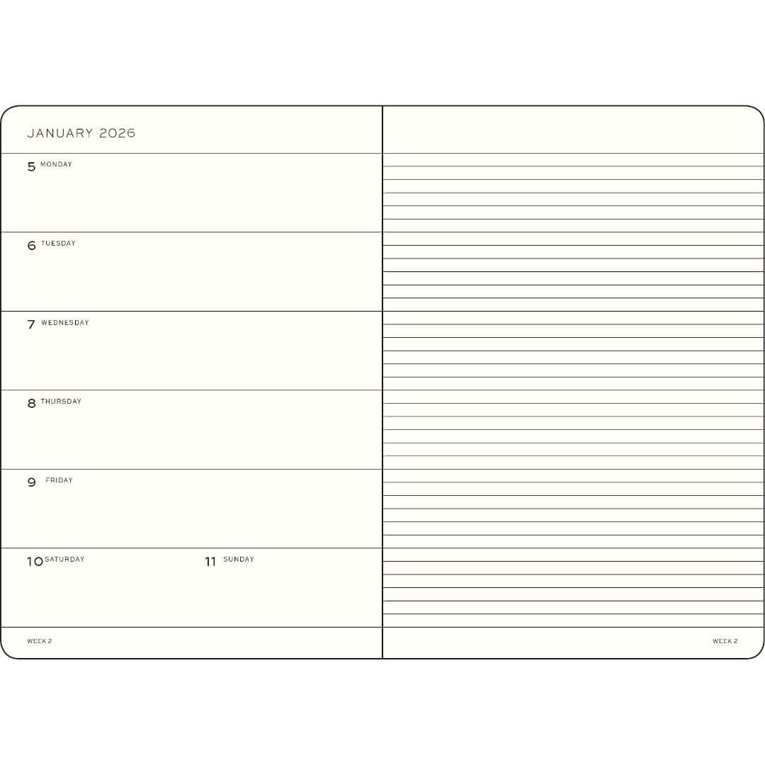 - Weekly spread with a lined notebook page opposite