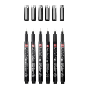 This set contains 6 fineliners in nib sizes: 1 x 005 (0.2 mm), 1 x 01 (0.25 mm), 1 x 02 (0.30 mm), 1 x 03 (0.35 mm), 1 x 05 (0.45 mm) and 1 x 08 (0.50 mm).