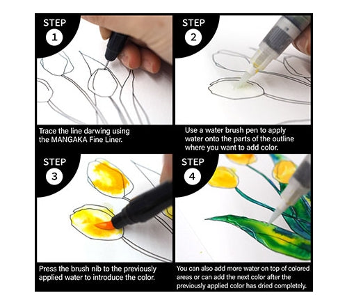 The Zig Exploring Watercolor – How to Paint Flowers Kit (Tulips) is designed to teach simple, expressive flower painting using easy wet-on-wet techniques. This set includes all the tools needed to learn the process step by step, from outlining with a Mangaka fineliner to blending colour with brush pens and metallic accents.